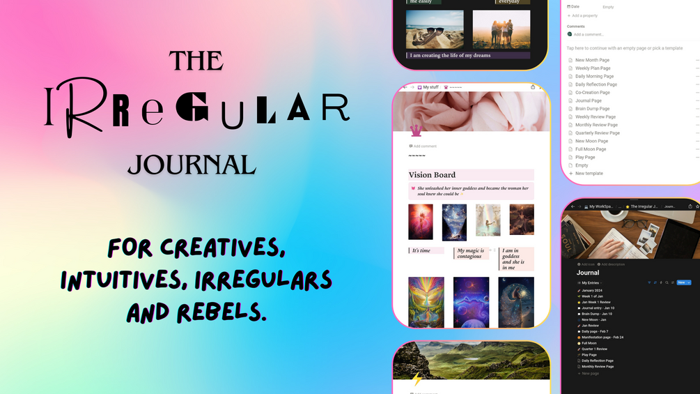 The Irregular Journal is the digital Notion space built for flow, not force. It’s designed to meet you exactly where you are and welcome you back without guilt, whenever inspiration strikes 🌙.